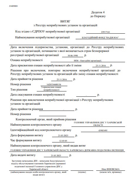 | Отримувач: Благодійний фонд «НАДІЯ.юа» |